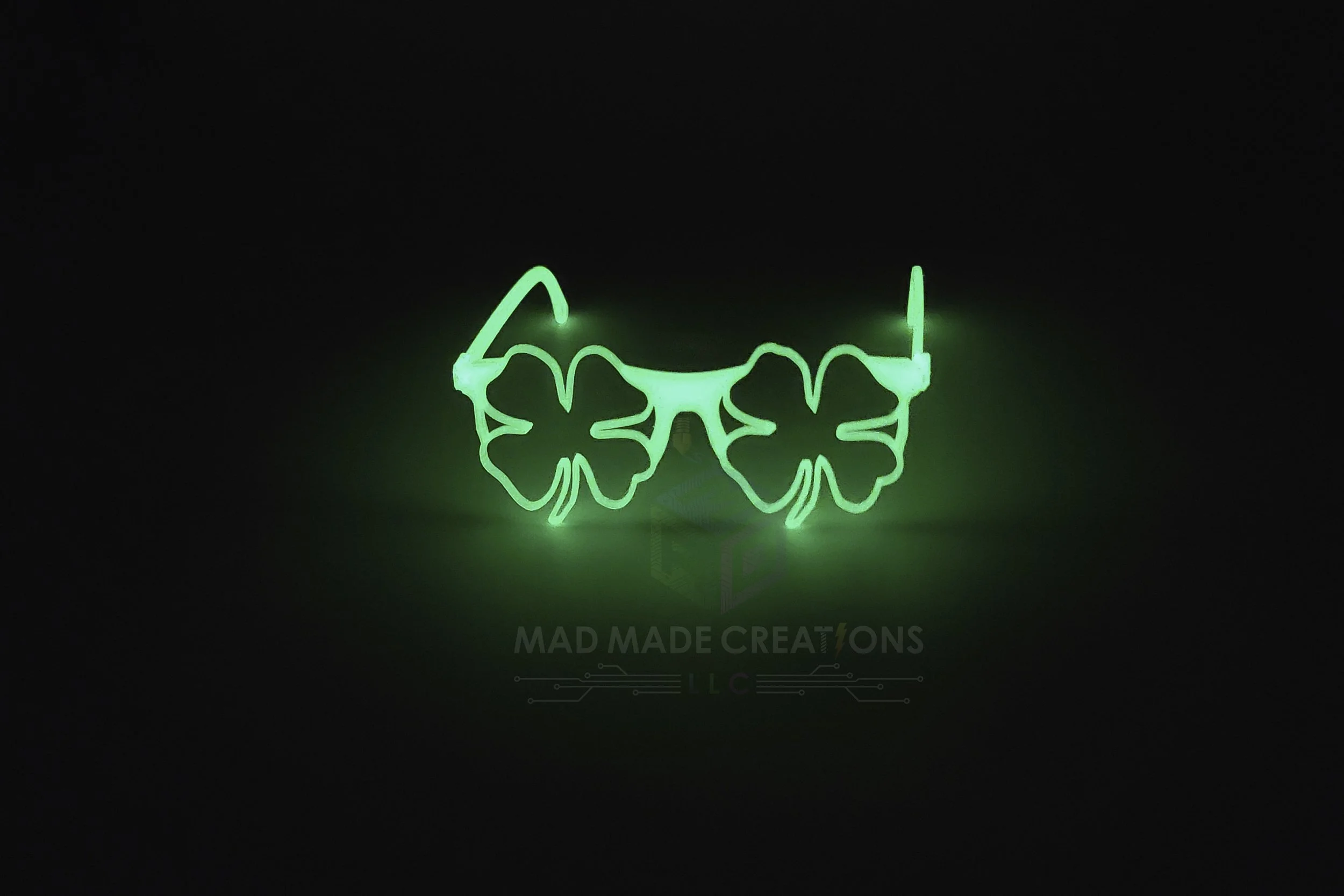 Light up the night this St. Patrick’s Day with our 3D printed St. Patty's Day - Shenanigans Glow-In-The- Dark Glasses — designed and crafted by MAD Made Creations LLC. Featuring bold four-leaf clover frames and vibrant green photoluminescent material, these novelty St. Patty’s Day glasses absorb light during the day and glow bright in the dark for nighttime parties, parades, bar crawls, and festive celebrations.